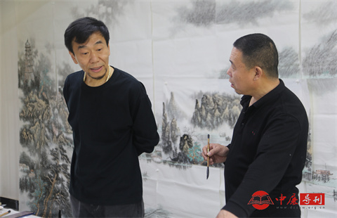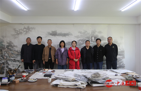 大家围绕雄安新区设立九周年的文化发展为主题,从文学创作、书画艺术等角度展开交流,探讨如何以笔墨语言展现雄安的城市肌理与人文温度。合影中,名家们立于铺展的书画作品前,背景里的山水长卷尽显雄安风貌,桌上散落的笔墨纸砚则见证着这场文化交流的浓厚氛围。