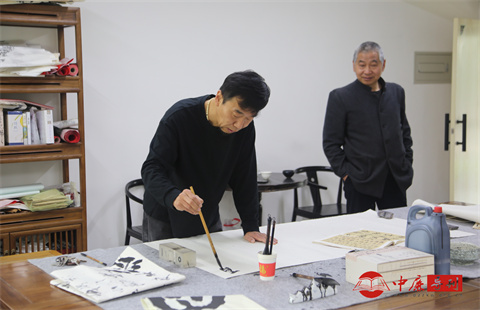 交流环节,书画创作成为核心亮点。书画名家王乐海手持毛笔,专注地在宣纸上挥毫泼墨,黑色的墨汁在白纸间流转,尽显书法艺术的魅力。身旁的几位文化名家凝神驻足,细致观摩笔墨技法,不时轻声交流创作心得,从笔法技巧到艺术构思,从传统文化传承到雄安特色融入,展开热烈探讨。桌上摆放的墨汁、砚台、字帖等工具,以及窗外的明媚绿意,共同构成了一幅充满艺术气息的生动画面。